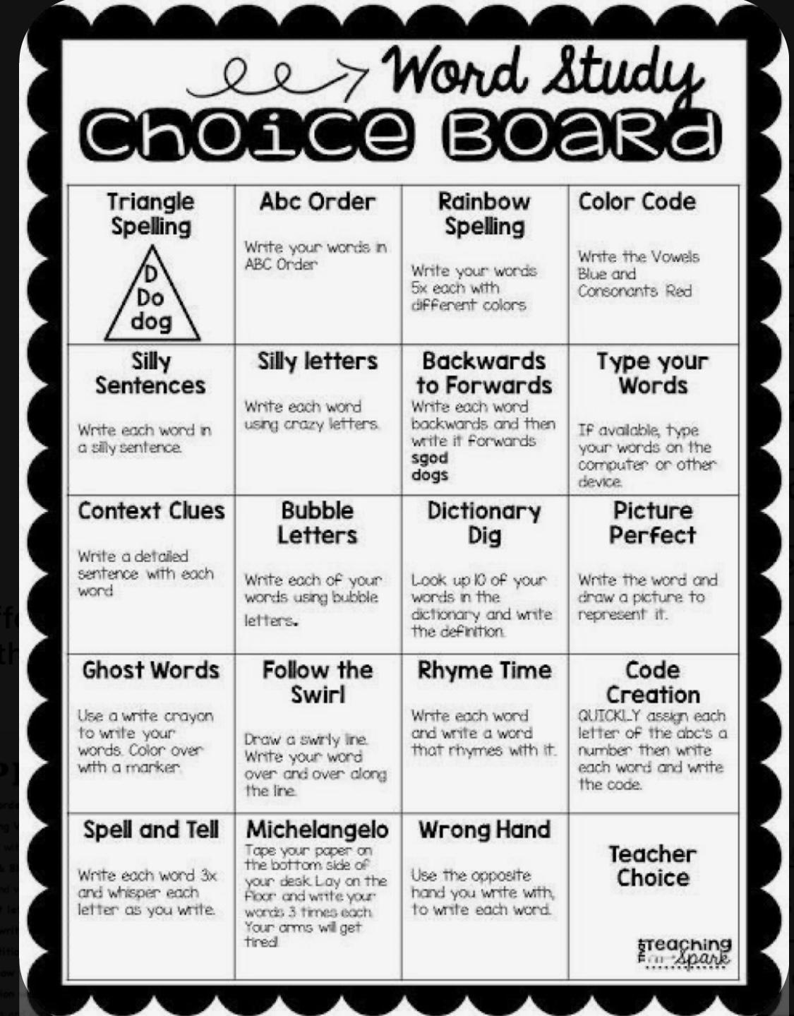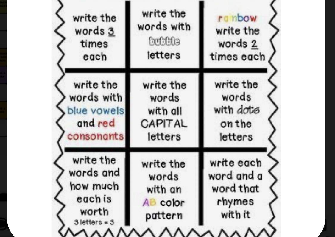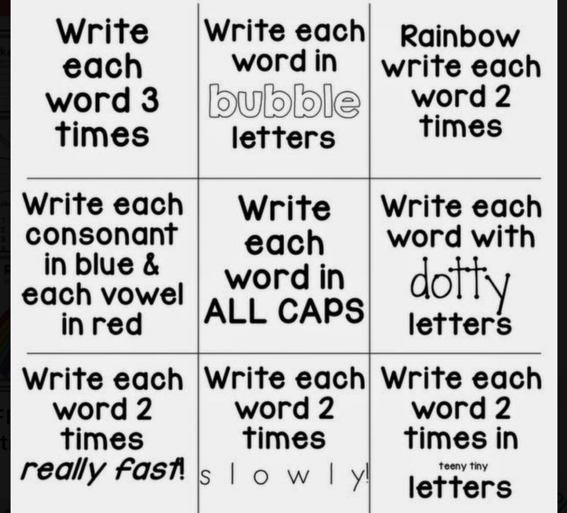 esto no es una tarea, mas una lista de palabras frequentes en Ingles para estudiantes de 2do grado. Pueden escojer de las opciones de actividades para que mis estudiantes las practiquen en casa. :)