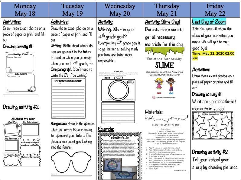Aqui podran encontrar las actividades para esta ultima semana de escuela espero mis estudiantes se entretengan en hacerlas y este Viernes Mayo 22 estaremos conectandonos por zoom a las 2pm para compartirlos y enseƱarlos a sus compaƱeros y poder despedirnos para ya comenzar el verano. Espero ver a todos mis estudiantes este Viernes.