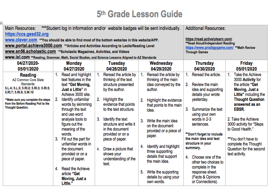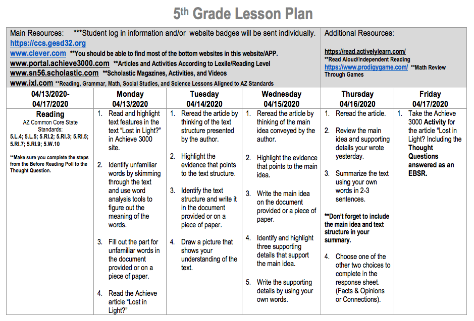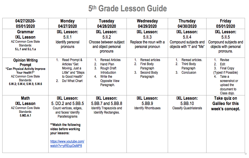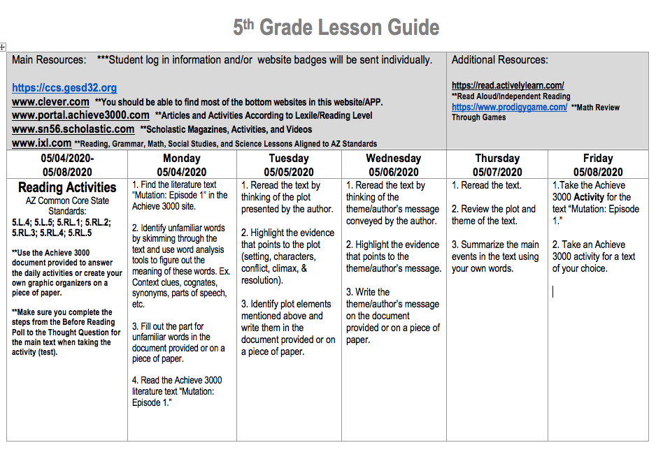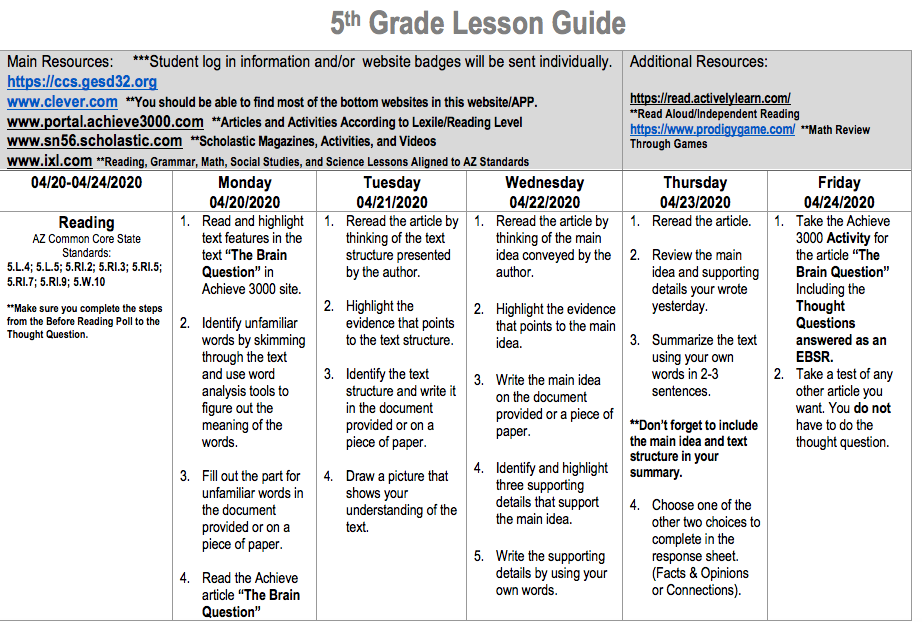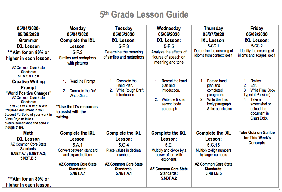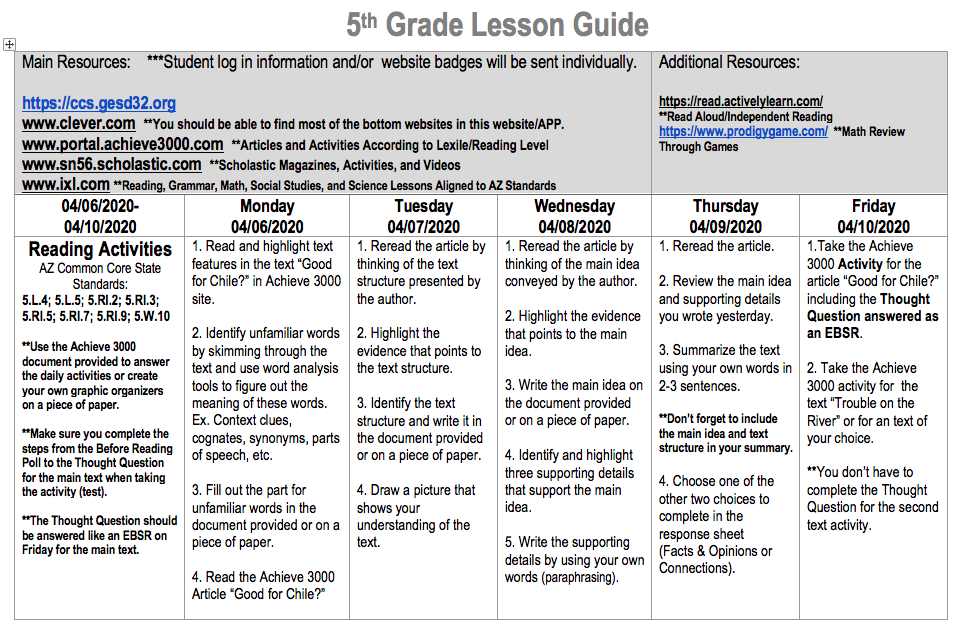 Please follow the weekly guide to complete daily assignments. TheCommunication will still remain through our class APP, Class Dojo, or through the sites. Remember to log in to www.clever.com from there you are able to log in to achieve and galileo. If you have any questions please send me a message through classDojo.