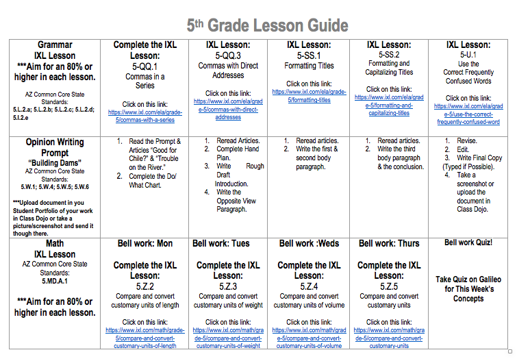 Parents this is the guide for students to work at home. All assignments will be submitted through class dojo from student portfolio. Remember to enter IXL to practice math and grammar. I will be sending user names and passwords through class dojo.