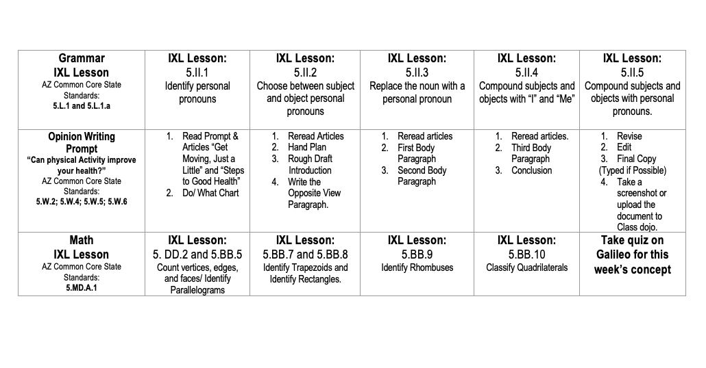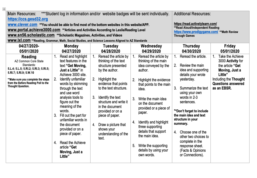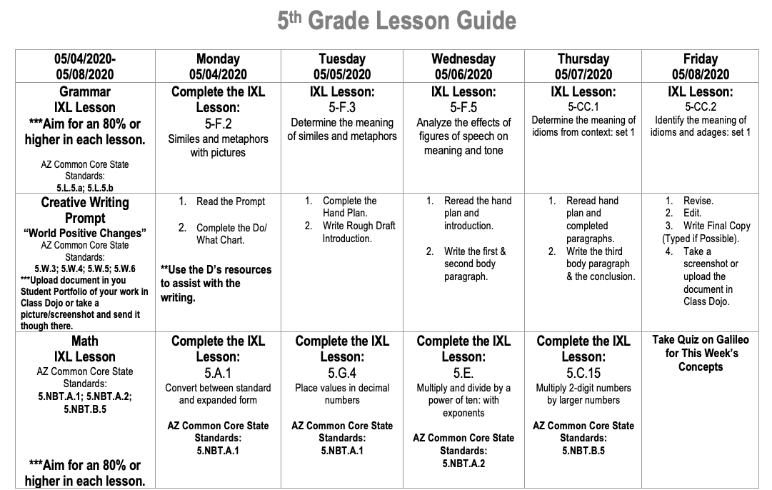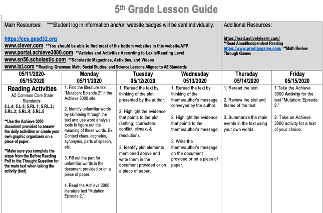 Please follow the weekly guide to complete daily assignments. TheCommunication will still remain through our class APP, Class Dojo, or through the sites. Remember to log in to www.clever.com from there you are able to log in to achieve and galileo. If you have any questions please send me a message through classDojo.