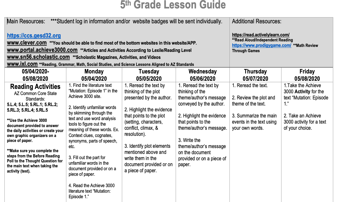 Weekly Lesson Guide- May 4th-8th, 2020