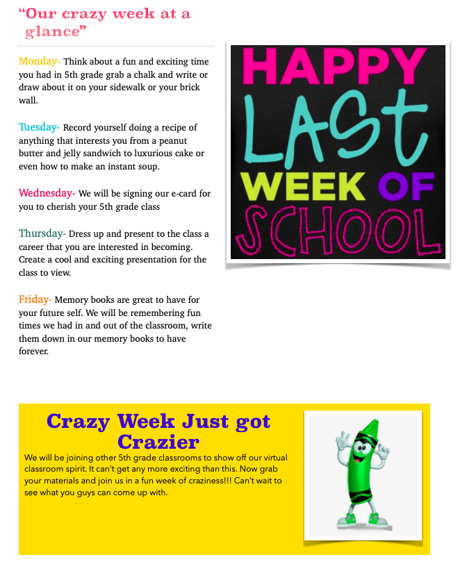 Please follow this weekly guide to complete daily assignments for math, reading, writing and grammar. All the links to resources/websites are also in the weekly guide provided here. Communication will still remain through our class APP Class Dojo. I will be revising work during school hours.
