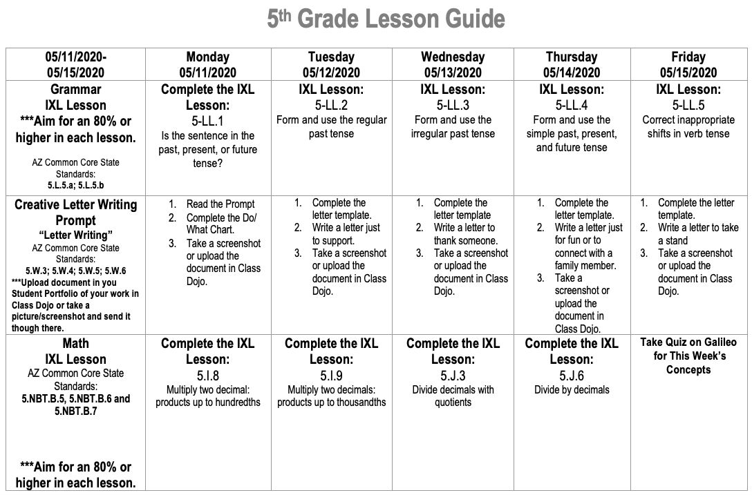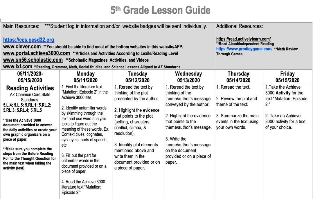 Please follow the weekly guide to complete daily assignments. The communication will still remain through our class APP, Class Dojo. Remember to log in to www.clever.com from there you are able to log in to achieve and galileo. If you have any questions please send me a message through classDojo.